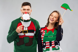 christmas, photo booth and holidays concept – happy couple in ugly sweaters posing with party props